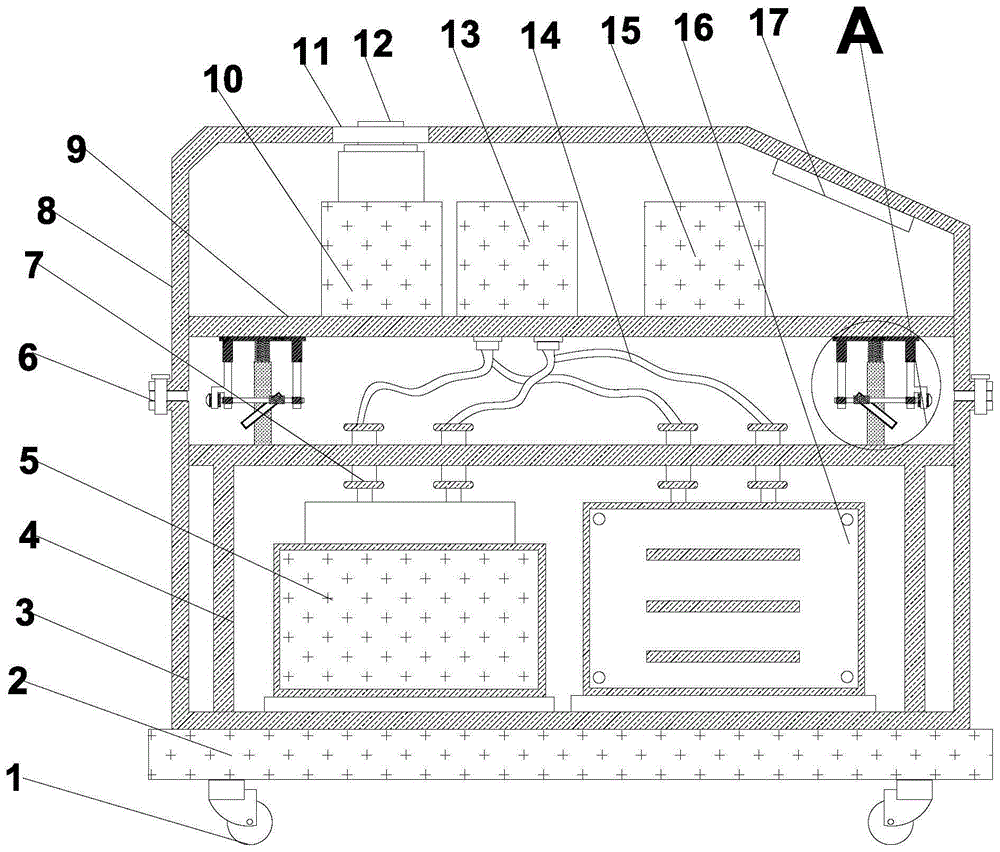 請參閱圖1~2,本實用新型實施例中,一種便攜式一體式智能電容器,包括底座1、下外殼3和頂板23;所述底座1的下端四個拐角處均設有滾輪1,且底座1的上側端部設有下外殼3,下外殼3的上側端部設有上外殼8,且上外殼8與下外殼3連接處的兩端均設有安裝螺栓6,且下外殼3的下端內側設有安裝架4,安裝架4的內部下端左側設有電抗器5,安裝架4的內部下端右側設有電容器本體16,且電容器本體16和電抗器5的上端兩側均設有接線柱7,且上外殼8的內部上側均設有安裝板9,且安裝板9的上端左側設有斷路器10,安裝板9的上端中間位置設有投切開關13,且安裝板9的上端右側設有控制器15;