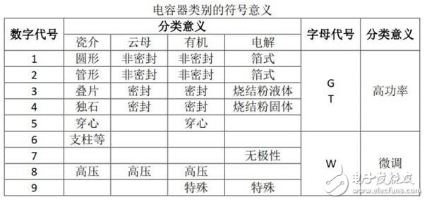 電容器類別由數字或字母表示,所表示的含義如下圖所示。