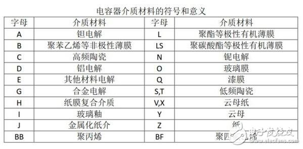 介質材料也是用字母來表示,電容器的介質種類也比較多,各個字母所代表的材料如下圖所示。