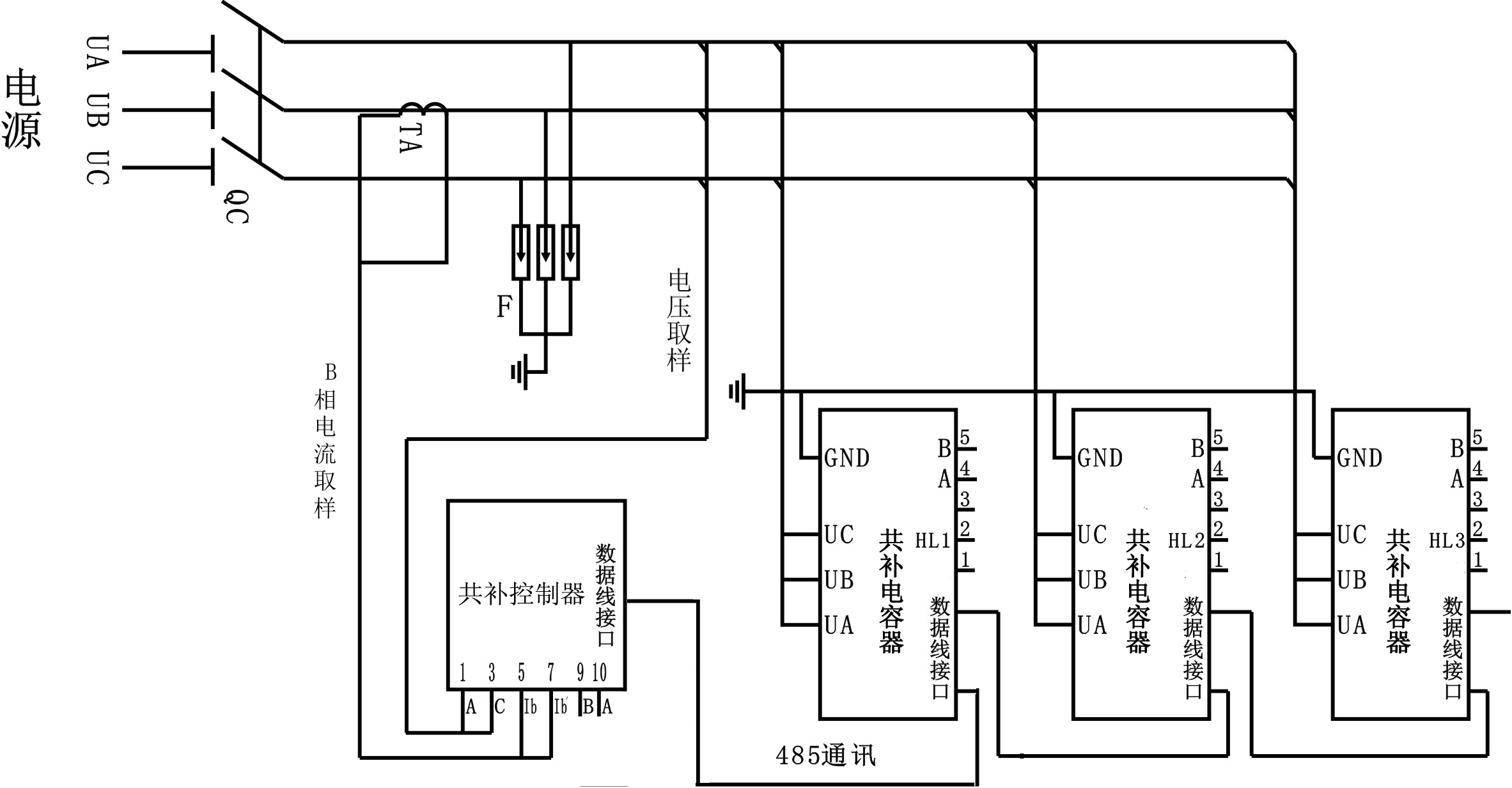2)采用RS485通信控制方式,混補控制器最多可同時控制20只共補電容器和10只分補電容器,共補控制器最多可同時控制32臺共補電容器。